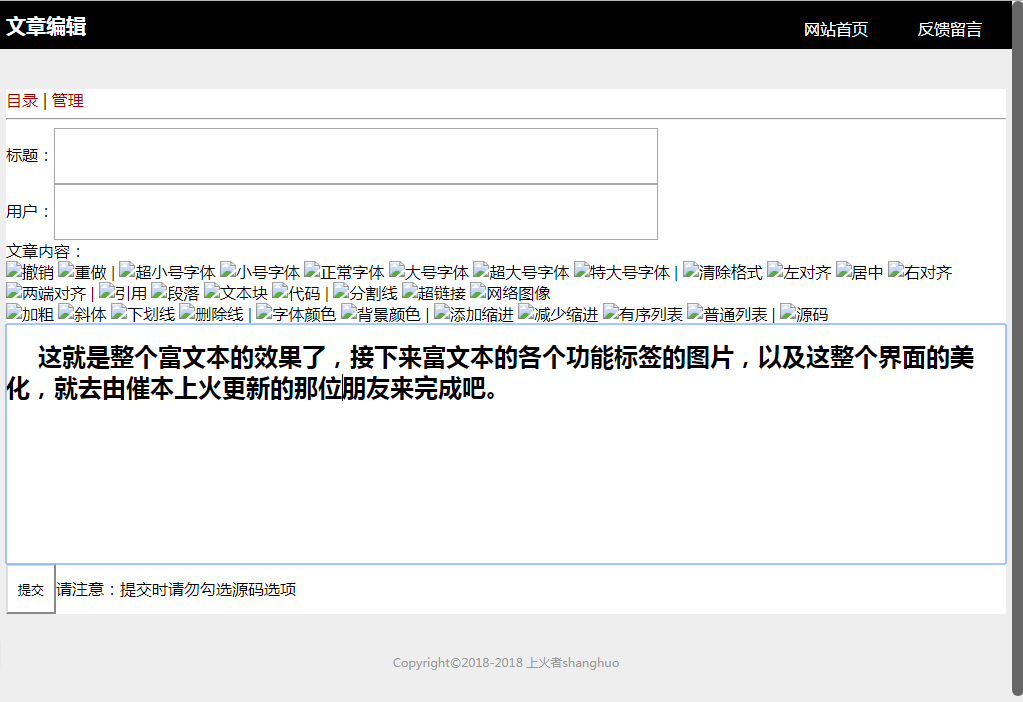 因为今晚时间有限,整个网站文章发布用的富文本就先做到这里,有空的时间再慢慢完善。之前其实上火有写过一个实验性的富文本编辑器,虽然支持的富文本编辑功能更多,但因为对浏览器的的兼容没处理好,那个富文本编辑器就先丢回我的实验库吧。先就这样了,各位晚安。2018-6-24,21:32