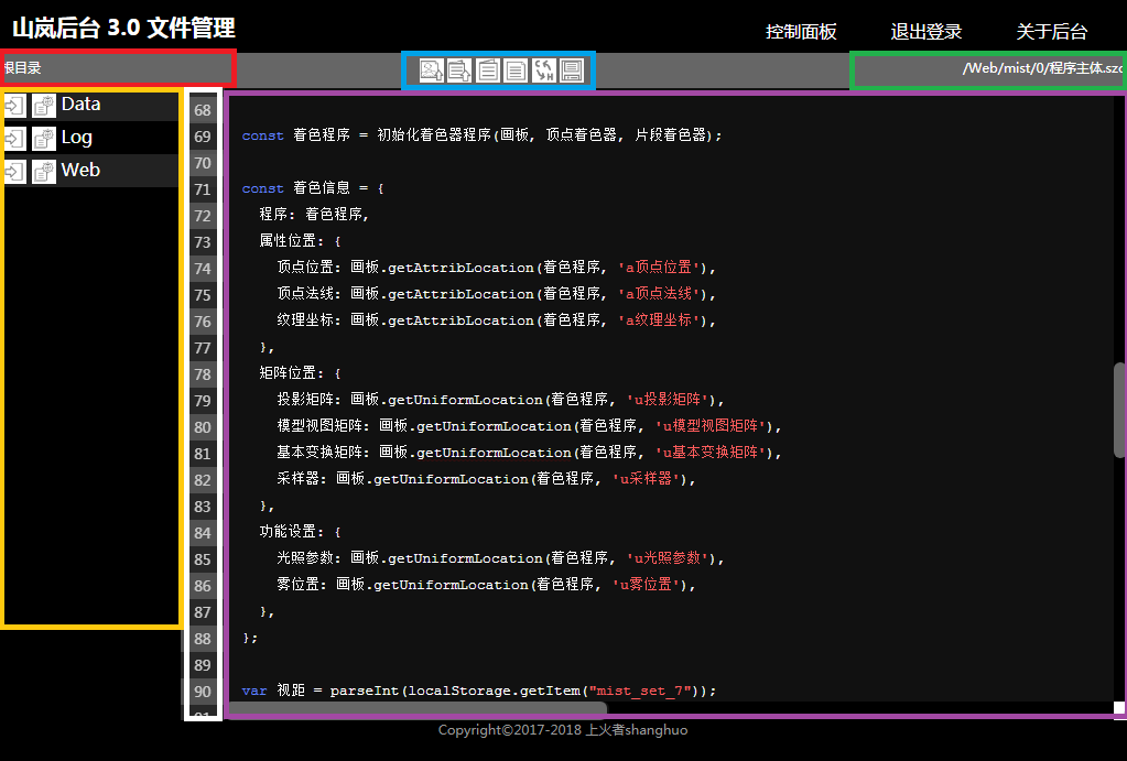 山岚后台3.0的高级编辑部分,主要用处就是文件管理,这个部分还原的旧版后台的核心功能,并进行了大量优化,方便了网站开发的高级用户对web程序的在线修改与编辑。因为这个部分获得了极高的直接读写目录权限,对于一般建站新手是用不上的,为了安全着想,这个部分被二次密码保护。