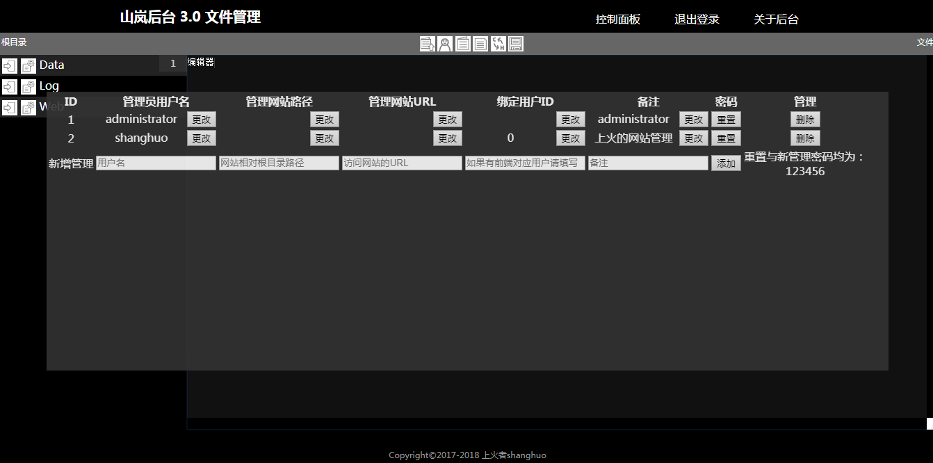 上图是目前实现的简单的管理员账户的管理,点击高级管理的基本菜单区的小人图标即可打开或关闭这个管理员账户管理界面。