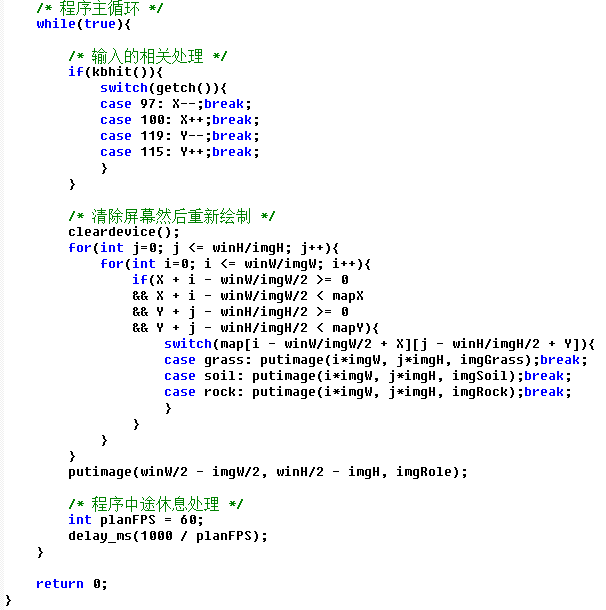 主循环结束,当然程序也该返回结束了,虽然目前永远执行不到那一步,都是直接关闭窗口就结束程序,但还是返回个0,,C语言的标准要求的我们还是要写到位,至于EGE关闭之类的,我们关闭窗口自然也就关闭了,所以这里也就可以先不处理了,以后要加初始界面等才需要涉及到处理。